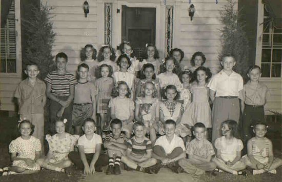 Second row, sitting on bench: Darla Hood, Louann Harman, and Dorothy Goble. Standing: Dick Dolph, Bert Fry, Doris Kroeger, Patricia_______ ?, Sue Wittich, Luetta Simmons, Barbara Beyer, Marian Anthis, Frank Daniel, and Jimmy Barnes.