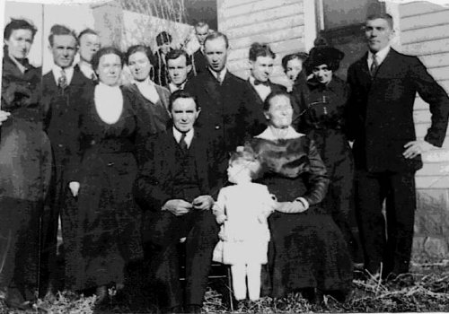 Grace & James Davis, Frank Hardin, in front of him, Emma Frances Davis Hardin, my granddad and grandmom, Nora Davis Slane and Clyde Slane, Nora died in the flu epidemic shortly afterwards, on the porch behind them is Carolyn (Carrie) Conway Davis, (still living), husband Elmer Davis, Thomas Davis, died in an accident (was electrocuted while working on electric company poles the next year in downtown Oklahoma City, Roy Bertrand Elder and wife Maude Grace Davis Elder, Ethel Davis Alexander, and husband Lloyd Alexander, an Oklahoma City fireman who died while on the way to a fire in Oklahoma City, when the truck was hit broadside by a car that failed to yield the right of way, and seated in front is Harriett Moore Davis and Marimon Davis with granddaughter, Leitha Slane, daughter of Nora Davis Slane and Clyde Slane.