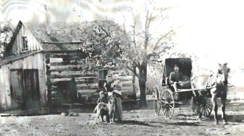 Standing in front of their home about 1894 are, left, Eleanore Römer Scheihing (19 Feb 1873 Climbach, Hessen - 16 Mar 1947) holding her first daughter, Ada Louise (Mrs. Warren Elliott), (13 May 1893 - 9 Sep 1973); standing by her is her first son, Heinrich Wilhelm (Henry William) (31 Dec 1890 Burlington IA - 15 Oct 1958). In the buggy at right is C. W. (Carl Wilhelm, or Charles W.) Scheihing (10 Dec 1865 Untertürkheim, Württemberg - 26 Mar 1947). The dog's name is unknown. Grandpa always had a dog or two around his farm.