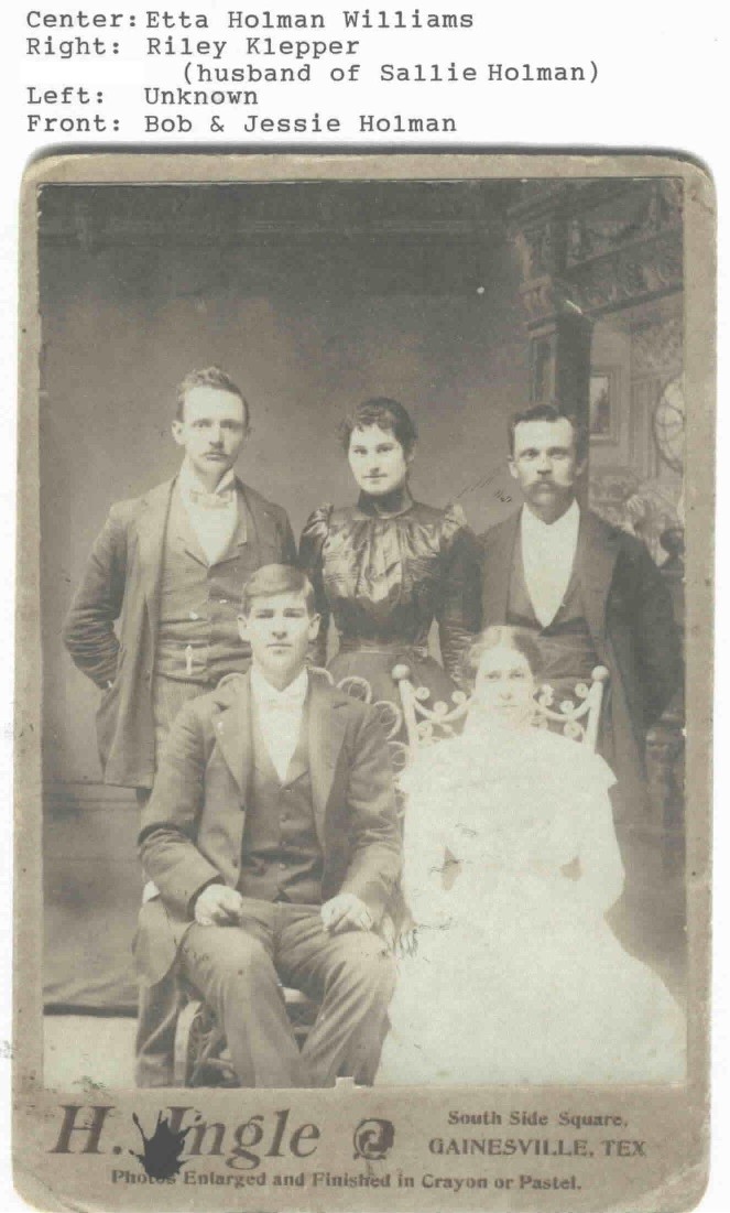 Cooke Co., TX at the marriage of W. George Williams and Etta Holman. Jessie was a Lyburger, wife of Robert T. Holman. Trying to find out if the UNKNOWN male is perhaps my grandfather, W. George Williams. Please email the submitter if you can help Mary Webster bee-gard@lcc.net