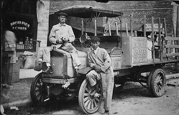There is a harness repair shop in background to the right. Probably a grocery or bakery store immediately behind the first man on the left as the window reads, "Bread, Pies & Cakes". The vehicle pictured has the following signs on it: "Phone 10", "Serve New State Coffee Your Grocer Has It".