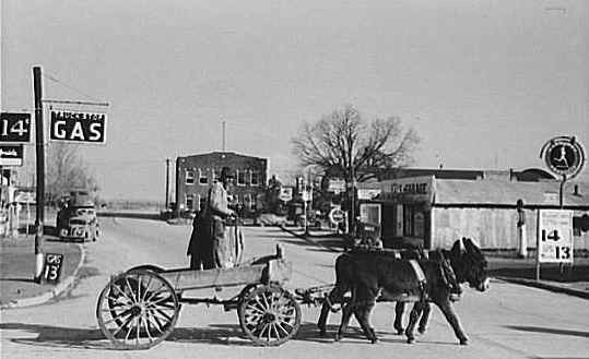 Farmer crossing Main street in Eufaula, Oklahoma, 1940. City Hall in background