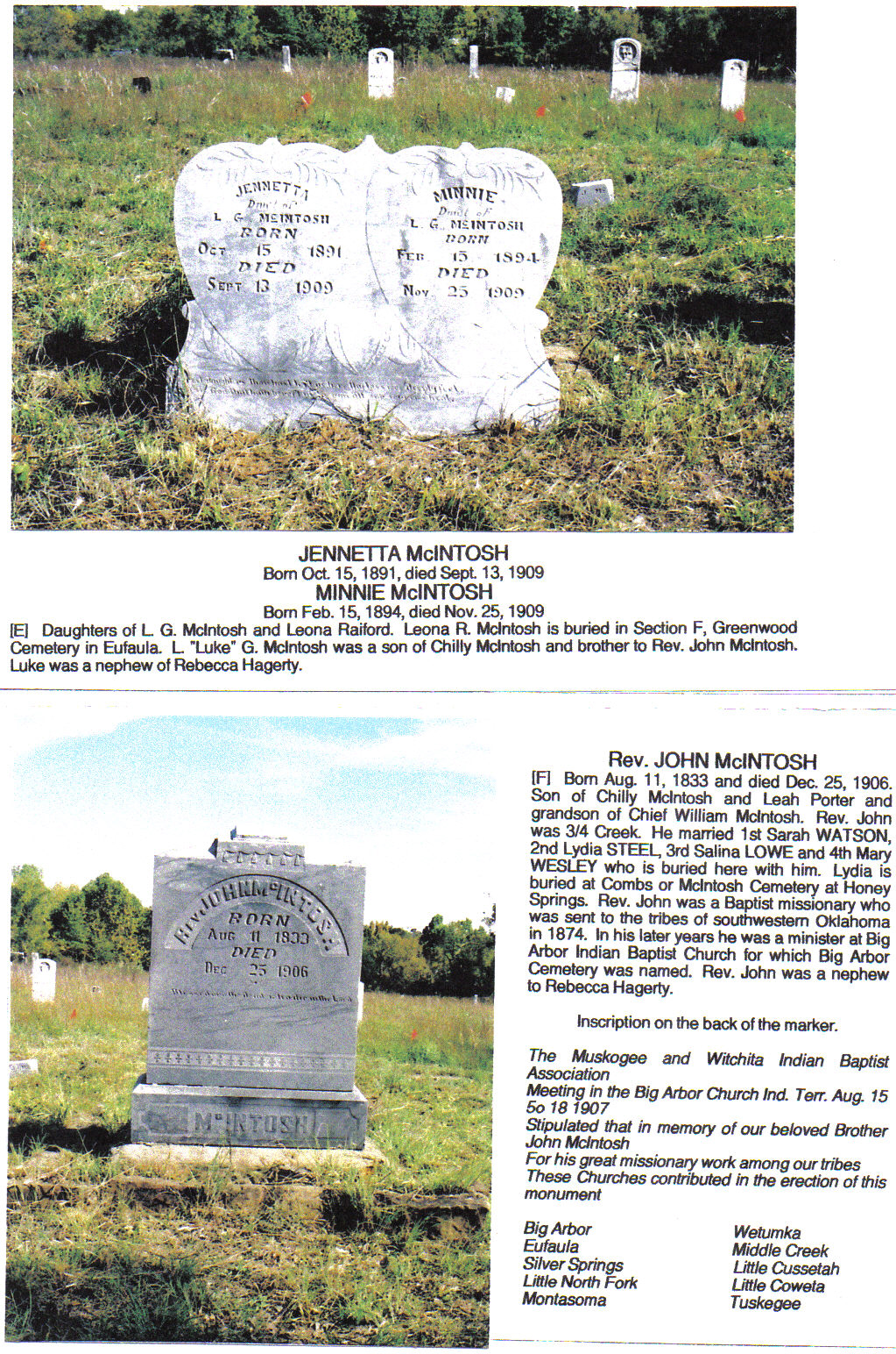 BIG ARBOR CEMETERY (McIntosh County, Oklahoma) This cemetery was located in McIntosh County, Oklahoma, in Sec. 6, TlON, R16E. There were about six unknown graves Reinterment was made adjacent to Fishertown Cemetery in McIntosh County, Oklahoma, in Sec. 18, T10N, R17E. Fife, Baby 12 Mar 1902 17 Mar 19O2 Fife, Silla 14 Aug 1899 23 Oct 1901 Lasley, James ---- ---- Lasley, Sam (Infant) ---- ---- McIntosh, Jennete 15 Oct 1891 13 Sep 1909 McIntosh, John, Rev. 11 Aug 1833 25 Dec 1906 McIntosh, Mary ---- ---- McIntosh, Minnie 15 Feb 1894 25 Nov 1909 R. S. (Initials only) ---- ---- |