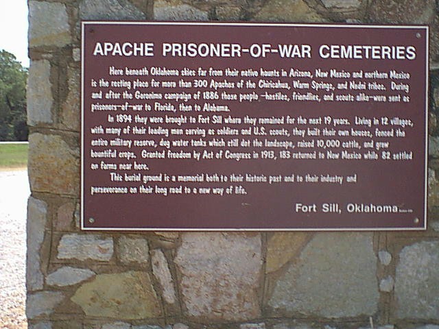 Here beneath Oklahoma skies far from their native haunts in Arizona, New Mexico and northern Mexico is the resting place for more than 300 Apaches of the Chiricahua, Warm Springs, and Nedni tribes. During and after the Geronimo campaign of 1886 these people—hostile, friendlies, and scouts alike—were sent as prisoners-of-war to Florida, then to Alabama.
