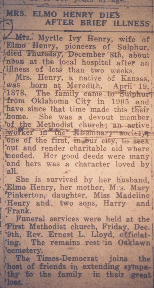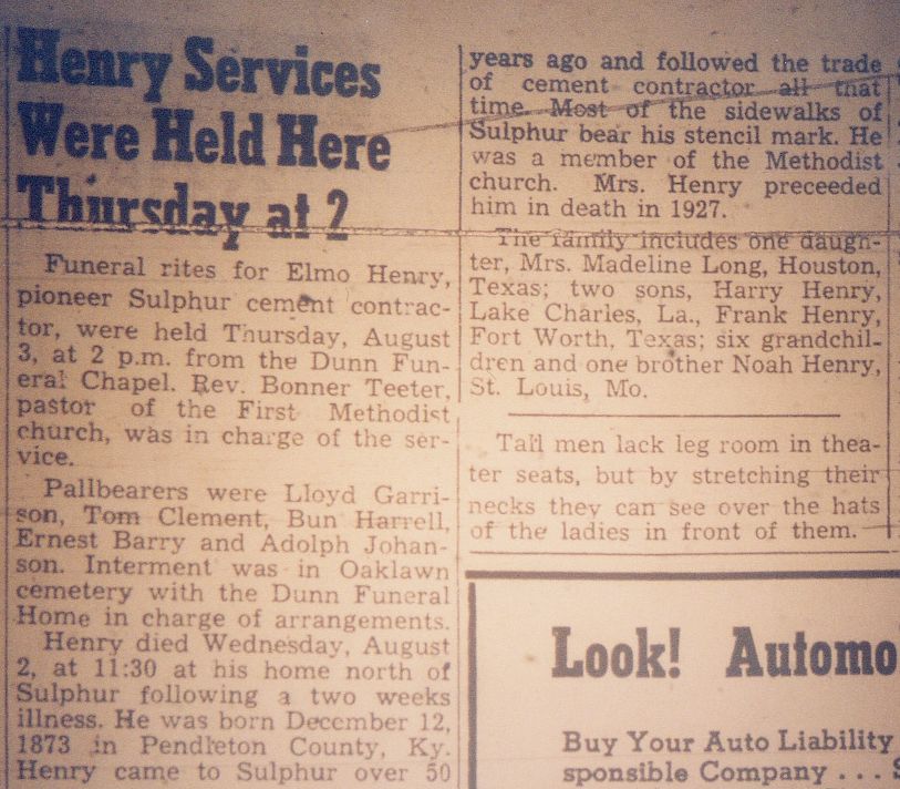 Funeral rites for Elmo Henry, pioneer Sulphur cement contractor, were held Thursday, August 3, at 2 p.m. from the Dunn Funeral Chapel. Rev. Bonner Teeter, pastor of the First Methodist church, was in charge of the service.Pallbearers were Lloyd Garrison, Tom Clement, Bun Harrell, Ernest Barry and Adolph Johanson. Interment was in Oaklawn cemetery with the Dunn Funeral Home in charge of arrangements.Henry died Wednesday, August 2, at 11:30 at his home north of Sulphur following a two weeks illness. He was born December 12, 1873 in Pendleton County, Ky. Henry came to Sulphur over 50 years ago and followed the trade of cement contractor all that time. Most of the sidewalks of Sulphur bear his stencil mark. He was a member of the Methodist church. Mrs. Henry preceded him in death in 1927.The family includes one daughter, Mrs. Madeline Long, Houston, Texas; two sons, Harry Henry, Lake Charles, La., Frank Henry, Fort Worth, Texas; six grandchildren and one brother Noah Henry, St. Louis, Mo.