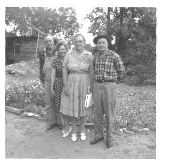 Left to right, Meride and Mary GREGORY MAXEY, Audrey HOLLOWAY BRAWLEY and husband Newton Winfield BRAWLEY.  This was taken at the MAXEY's house in Lone Wolf, Kiowa Co., OK