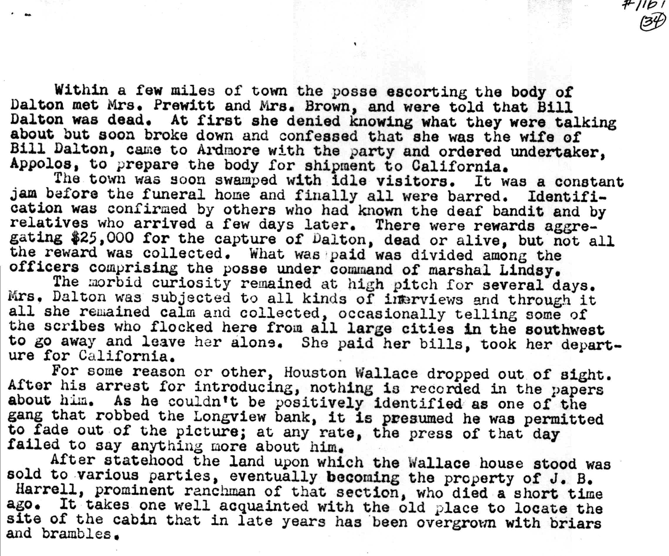 only "Arkansas Tom" was captured. Who Killed Bill Dalton?In the early morning hours of June 8th, 1894, on the Houston Wallace ranch in the Arbuckle Mountains, U.S. Marshals Loss Hart and Seldon Lindsey shot and killed Bill Dalton, the last of the Dalton Gang. Dalton was wanted for the robbery of the Longview bank among many other bank and train robberies. There was an aggregate of $35,000 in rewards for Bill Dalton, dead or alive. It was common for the time for the posse to split the rewards of any captured felon. If the criminal was not captured, the posse got nothing for their trouble. The officers went into the house after the shooting and pandemonium brOKe loose. The children were crying, the young girl was screaming and the other man seen at the window in the house had mysteriously disappeared. The marshals tried to console the children and assure them they would not be harmed. Young Gracie and Charles Dalton, age 6 and 8 were terror stricken at seeing their father killed. The posse began searching the house for the money. It was stashed all over the log cabin but the major portion of the loot was nowhere to be seen. The marshals happened to remember that Bill Dalton had a particular fancy for trap doors and pulled a rug off the floor. Sure enough there was a trap door under the rug. Beneath the floor was a bank bag from the Longview bank containing $1,700. They had their proof that it was the Dalton gang that robbed the bank. Also found in the cabin was the trunk of the Mrs. Smith who was detained in Ardmore. The lawmen found bundles of letters addressed to her, “Jane Dalton”, at Fresno, California and mailed from Oklahoma Territory. This is the cause for the reasoning that Bill was in this country well before his brother’s ill-fated raid on Coffeyville. Dalton’s body was placed in a wagon belonging to Houston Wallace and the procession headed back to Elk to retrieve their horses. On the way back to Elk, the still dead drunk posse man was lying beside the road. The posse stopped and laid him in the wagon beside Dalton’s body. Those of us who know how hot and humid it gets in the Arbuckles in the summer time can guess what was beginning to happen to Dalton’s body. The body was swollen so badly by the time the posse reached Milo, I.T. that they stopped at the well of Jim Alverson and poured twenty buckets of cool well water on the corpse in an attempt to reduce the swelling. This effort didn’t help the body much but did wash the blood off the clothing exposing the bullet hole in Dalton’s chest. Buck Garrett had released the two women as instructed by Lindsey and the wagon with Dalton’s body and the wagon driven by Mrs. Pruitt and Mrs. Dalton (alias Mrs. Smith) loaded with supplies met on the road about five miles from Ardmore. The women were told that Bill Dalton had been killed but both women disclaimed any knowledge of the outlaw. As the two wagons passed and Jane Dalton saw her husband’s body lying in the back of the wagon she became hysterical. She was placed in the wagon with the body and returned to Ardmore with the posse. The body was taken to Appolla’s Funeral Home where an estimated crowd of 1,000 people pushed and shoved to see a last glimpse of the King of Western Outlaws. Ardmore quickly turned into a circus of reporters not unlike today. This media frenzy is where the conjecture about the shooting came about. The second marshal and posse arrived well after the shootout at the Wallace Ranch. One of Lindsey’s posse men told this second marshal that Loss Hart had killed Dalton when in fact he couldn’t see who had done it because the shootout occurred behind the house. This second marshal is the person who told the press that Loss Hart had been the man. The only people to ever talked to the press about the shooting were the members of this second posse who were not even present when the shooting occurred. For some unknown reason Lindsey gave orders that the details would not be discussed. Marshal Lindsey's instructions to his posse that no one was to ever give details of the shooting to the press and not one of them ever did. But, as today, the reporters who were hounded for details by their editors back home, began to “assume” a lot of facts that were simply not true at all. At Appolla’s undertaking establishment, a doctor removed the two bullets that were still in Dalton’s body. A .38/56 Winchester ball, a peculiar caliber, was removed from the heart of Dalton. A .44 Winchester ball was removed from Dalton’s back. Lindsey used a .38/56 and Loss Hart used a .44 Winchester. There was even some conjecture that the death photo of Dalton was not really of him because the man was too “fat”. Remember that the marshals were pouring well water on the corpse to keep the swelling down with little effect on that hot Arbuckle Mountain June day. Who killed Bill Dalton? It really makes no difference. A man made a series of bad choices in his life and paid for it with the ultimate penalty. Jane Dalton’s husband and Gracie and Charles’ father was dead. The most hunted and feared outlaw of the 1890’s had seen his last sunrise.