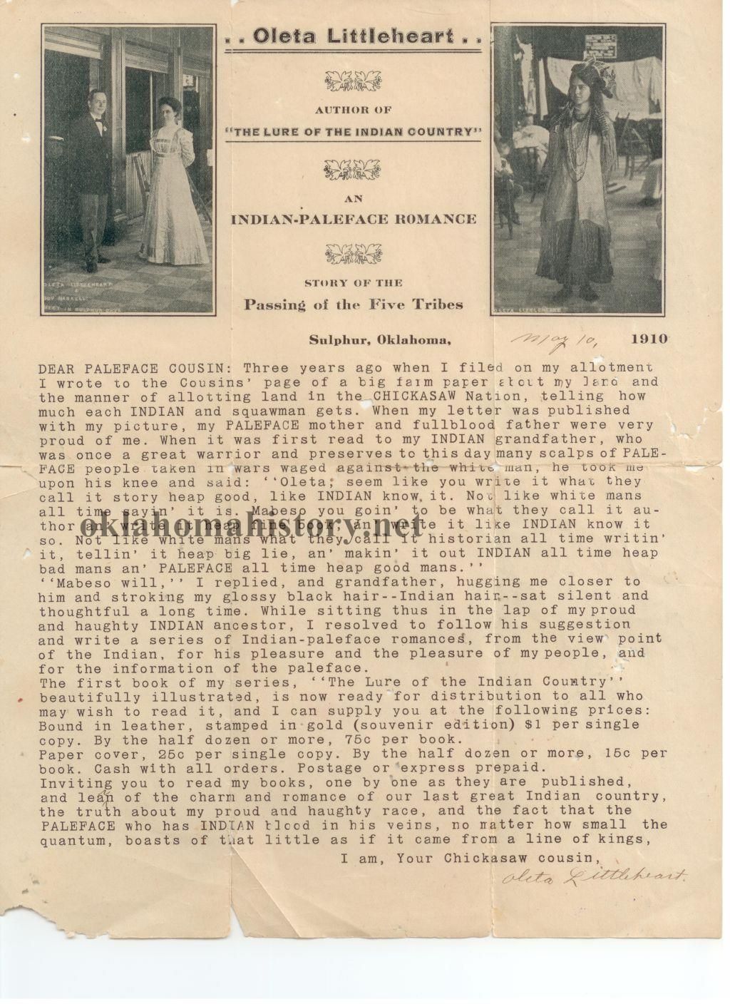Oklahoma has more in the way of fascinating Romance, Legend, History and Opportunities than any other state or country. My book "The Lure of the Indian Country" Tells you about it. Read it. 156 pages. Beautifully illustrated with lovely pictures of Indian Country characters and scenes. Paper Cover, by mail, 25c. Leather Cover, by mail, $1.00. Six of my post cards free with each book. Your Chickasaw Cousin, OLETA LITTLEHEART, Sulphur, Oklahoma.