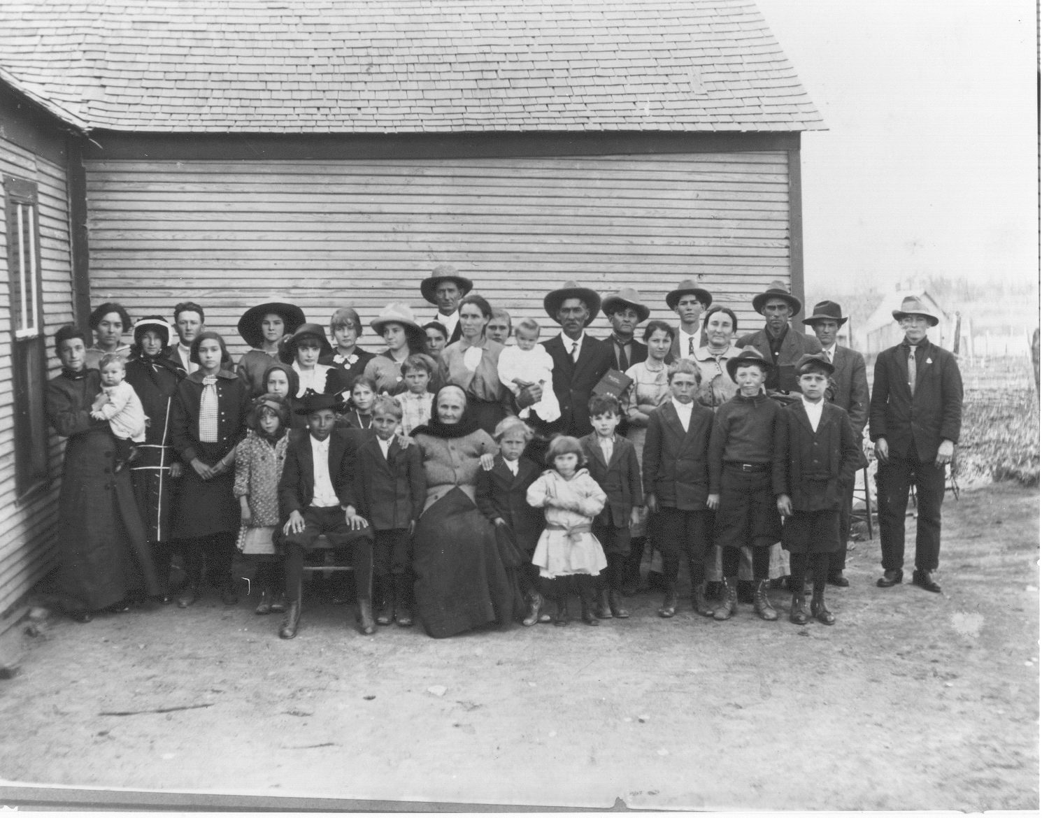 Picture taken during social at the G.W. Morris home near Iona in 1914. Left rear, Cora Morris Greenwood; third from left (in hat), Viola Morris Thrasher; rear forth from right in white shirt, tie and hat, Welcome Morris; Next to him on his right is Julius Greenwood; second row center (infant) Authur Waylon "Son" Morris being held by G.W. Morris; Nancy Elnora Gill Morris on left side of infant; Left side, Mamie Morris Herring in light colored blouse and hands clasped in front; Front center, young girl in light colored dress, Tillie Opal Morris Whisenhunt; Next to her (third boy from right) George Aaron Morris; at the end, right front with white shirt and cap is Andrew Jackson Morris. Submitted by Harvey Morris, June 2007.