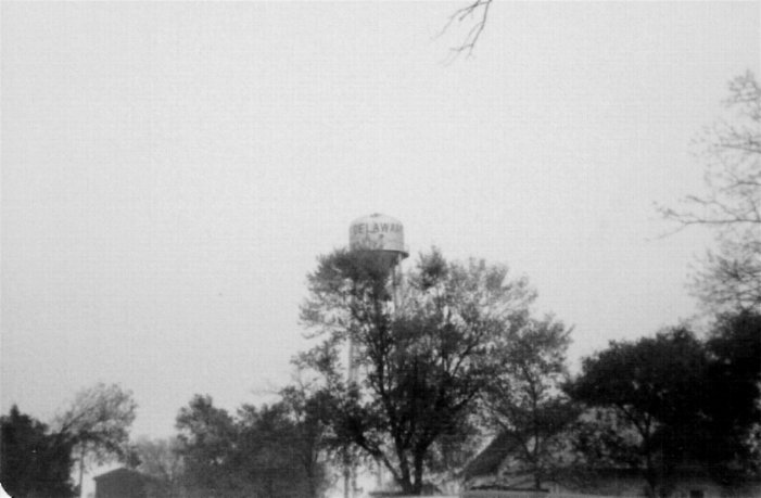 Delaware Water Tower Courtesy of Patricia Dill September 20, 2007 Received this from unknown person by e-mail September 11, 2007, from Bill Manard. This information is from the Delaware High School Newspaper (War Chief) which was published Jan. 13, 1939. The front page starts with: HISTORY of DELAWARE Contents of the article: In 1912 Delaware was a community in which agriculture and cattle raising were the principle industries. In the little village of Delaware the Negro population almost equaled that of the whites. In the same year racial difficulties which had existed for a long time, finally ended in a riot; as a result the Negroes were expelled from the Delaware community. The citizens then passed an ordinance which stated "that any Negro who remained in the town after sundown made himself subject to arrest," The following year an oil company found "black Gold," alter, in that same year, Delaware, a sleepy little farm community, became a noisy "oil-boom" town with a population of approximately 2,000. The business districts, which had formerly consisted of a small group of stores, now reached the number of about 59. These were: seven open saloons, a blacksmith shop, a city hall, depot, interurban, real estate office, bank post office, two drug stores, canning factory, two pool halls, theater, two barber shops, two filling stations, a bakery, two garages, a hardware, and farm implement store, four restaurants, and elevator, stockyard, two ice houses, two shoe shops, mill and feed store, lumber yard, three doctors' offices, telephone office, four grocery and dry goods stores and a tile plant. The three oil companies that existed then were: Diamond, Transcontinental, and Henderson. These companies were producing oil from shallow wells and in a few years there was a noticeable decline in the out put of oil from these wells. By 1921, Delaware had ceased to be a booming oil town. With the decrease of oil there was a decrease of population. Business firms moved their wares to other cities. Business buildings and homes were torn down, and moved to other cities and to the country. The city declined rapidly until it now consists of 24 business buildings, two grocery and dry goods stores, four filling stations, two garages, post office, depot, rooming house, grocery and meat market, restaurant, doctor's office, hardware, lumber yard, three barber shops, ice house, feed mill, pool hall, interurban, and a blacksmith shop. The total population is approximately 526. The High School building was constructed in the year of 1922.