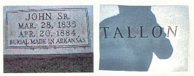 Tallon John E.Sr., March 28-1835, Ireland, d April 20-1884, Ark., wife, Mary