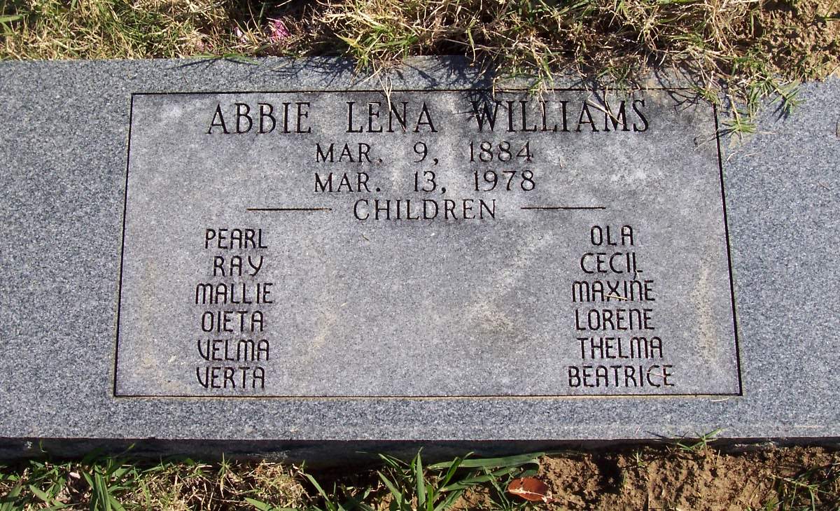 WILLIAMS, Abbie Lena, 9 Mar 1884 - 13 Mar 1978 (Mother of Pearl, Ray,