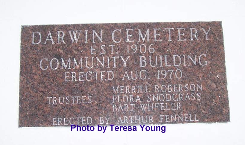 Darwin Cemetery Established 1906. Community Building Erected August 1970. Trustees: Merrill Roberson, Flora Snodgrass & Bart Wheeler. Erected by Arthur Fennell.