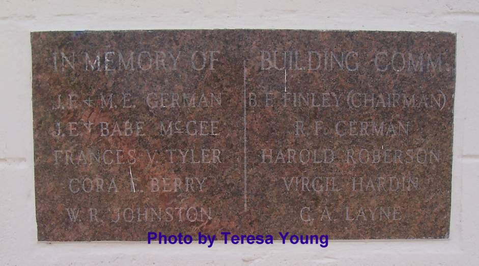 In Memory of J. F. & M. E. German, J. E. & Babe McGee, Frances V. Tyler, Cora E. Berry & W. R. Johnston - Building Comm: B. F. Finley (Chairman), R. F. German, Harold Roberson, Virgil Hardin & G. A. Layne