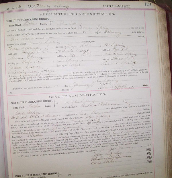 BOND OF ADMINISTRATION. We, JOHN SPRING as principal and ANDREW BOHANNON and DAVE OAKES as sureties, acknowledge ourselves to be indebted to United States of America in the sum of One Thousand Dollars. The condition of the above obligation is such, that if the above bounden, JOHN SPRING, administrator of all and singular the goods and chattels, rights and credits of NANCY SPRING, deceased, shall make or cause to be made, a true and perfect inventory of all and singular the goods and chattels, rights and credits of the deceased, which have or may come to the hands, possession or knowledge of him, the said JOHN SPRING, or into the hands or possession of any other person for him, and the same so made shall return and exhibit in the office of the Clerk of the Court of Probate in the Central District of the Indian Territory, at Antlers, within sixty days of the date of the above obligation, and all and singular the goods and chattels, rights and credits of the deceased, which shall come to the hands, possession or knowledge of him, the said JOHN SPRING, he shall well and truly administer according to law, and pay the debts of the deceased as far as his assets will extend and the law direct; and further, make or cause to be made just and true accounts of his administration, and make due and proper settlement thereof, from time to time, according to law or the lawful order, sentence or decree of any Court having competent jurisdiction, and shall moreover well and truly do and perform all other matters and things touching said administration, that are or may be prescribed by law, or enjoined on such administration by the lawful order, sentence or decree of any Court having competent jurisdiction; then the above obligation to be void and of no effect, otherwise to remain in full force and virtue. IN WITNESS WHEREOF, we have hereto subscribed our names and affixed our seals this day 19 of January A. D., 1905. Signed by: JOHN SPRING, ANDREW BOHANNON and DAVE OAKES We, JOHN SPRING , as principal and ANDREW BOHANNON and DAVE OAKES sureties on the within bond, do each of us solemnly swear that we are worth, over and above our indebtedness and all liabilities and exemptions, the respective amounts set opposite our names, and that our property is within the Indian Territory: JOHN SPRING, $500.00, ANDREW BOHANNON, $500.00; DAVE OAKES, $500.00. Subscribed and sworn to before me this 19 day of January A. D. 1905. Signed by CHAS. G. SHULL, Notary Public LETTERS OF ADMINISTRATION. Know Ye, That Whereas, NANCY SPRING of the Antlers Judicial Division of the Indian Territory died intestate, as it is said, on or about the 25 day of February A. D. 1903, having at the time of his death personal property in the Indian Territory which may be lost, destroyed or diminished in value, if speedy can be not taken of the same; to the end therefore, that the said property may be collected, preserved and disposed of according to law, we do hereby appoint JOHN SPRING of said Central District of the Indian Territory, administrator of all and singular the goods and chattells, rights and credits which were of the said NANCY SPRING at the time of his death, with full power and authority to dispose of the said property, according to law, and to collect all moneys due the said deceased, and in general to do and perform all other acts and things which are or hereafter may be required by him by law. Witness, The Honorable THOS C. HUMPHRY, Judge of the United States Court in the Indian Territory, and the seal thereof, at Antlers in the Indian Territory, this 20 day of January A. D. 1905. Signed by JOS. R. FOLTZ, Deputy and E. J. FANNIN, Clerk (Note from Teresa Young: Hard to decipher one heir's name, IARIN SPRING. It could be Clarsie, Iarsie, etc. It is the reason I am sending photo so you can see it yourself. Also notice Ego, Indian Territory. I believe that is the clerk's error. It should be Hugo, Indian Territory) |