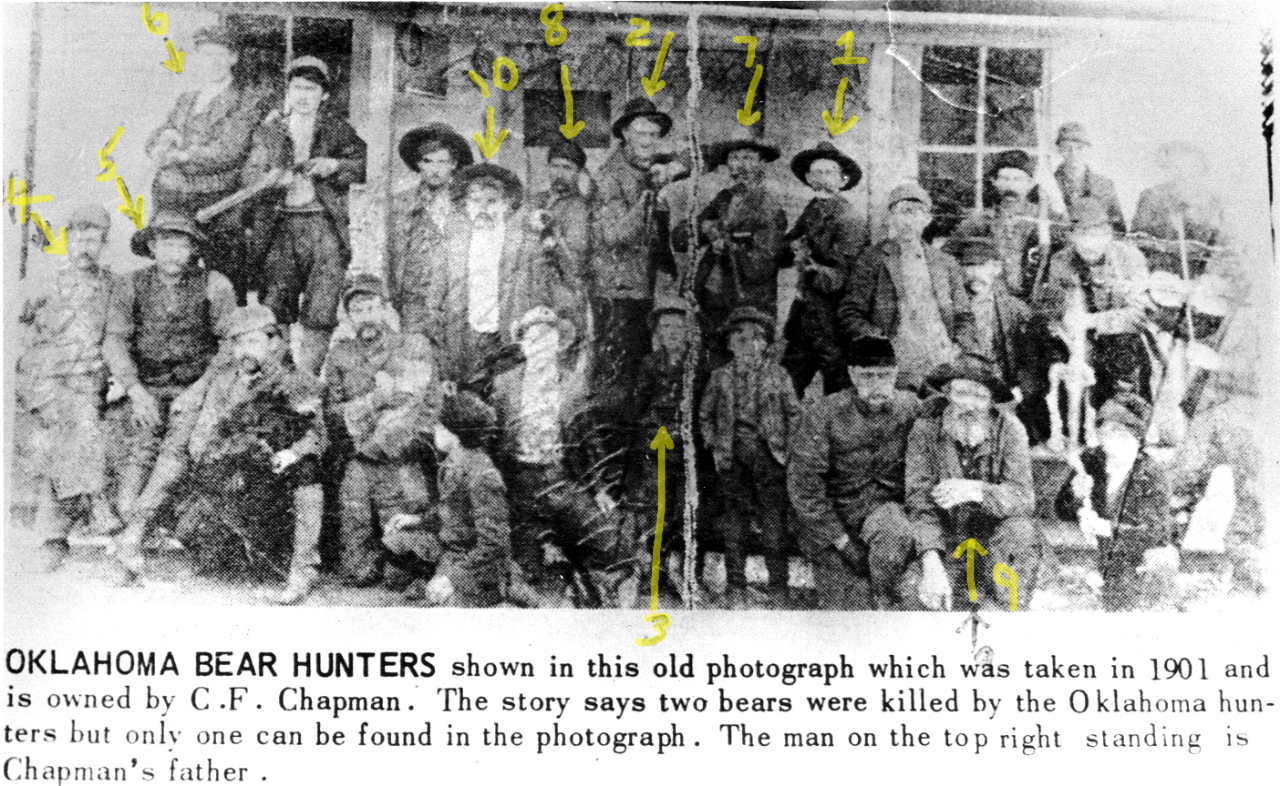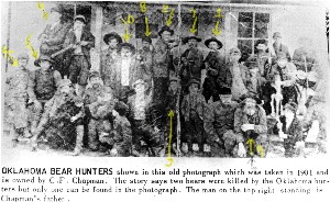 view full size image![]() submitted by Les Walling" OKLAHOMA BEAR HUNTERS shown in this old photograph which was taken in 1901 and is owned by C. F. Chapman. The story says two bears were killed by the Oklahoma hunters but only one can be found in the photograph. The man on the top right standing is Chapman's father