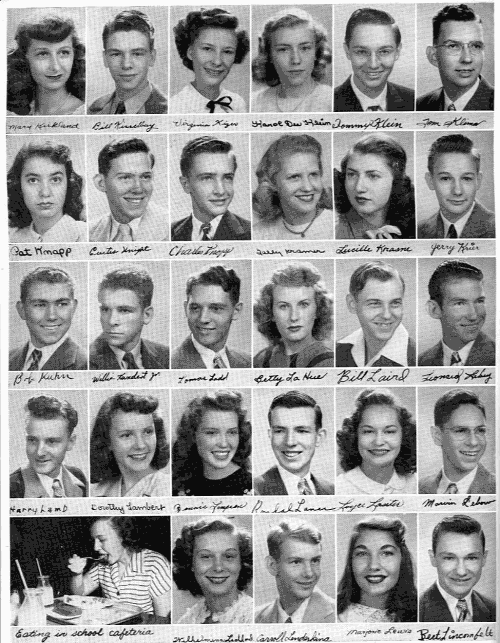 Row 5: Eating in school cafeteria, Wilhemina Ledford, Carroll Lenderking, Marjorie Lewis, Bert Lincomfelt