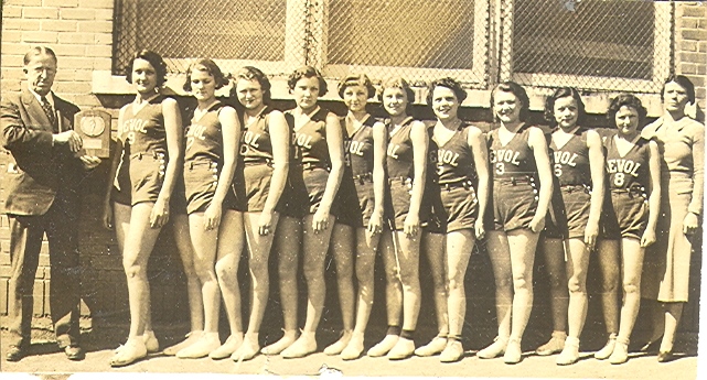 1935 Mrs. Stinson's girl's basketball team, Supt. Harned on left