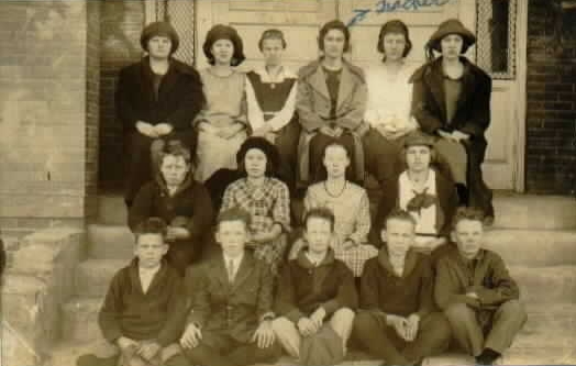 On the back: "6th grade Mrs. Jane Steal, Maggie Obrian, Stella Werts, Dorothy Hoy, Elisie Thompson, Dallie (?) Spicer, Pluma Obrian, Lois Gardner, Vera Gardner, Loyd Crain, Joe Buck, Ray Thompson, Ralph Brown, George Howell, Clarence Halton.
