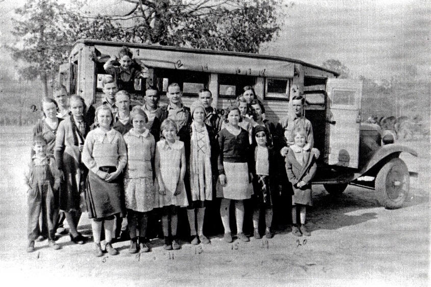 Redlands Bus Route to Haworth - 1932-33 Redland Bus Route to Haworth 1932-33. Back Row (L-R) Marie Farley, Wesley Dollarhide, Joe Weems, Gillis Daniels, Adolph Bozarth, Bill Dollarhide, Lawrence Dillard, LeFlore Melson, Erma Boyd, Lorene Hughes and bus driver Andrew Fuller. Boy in bus window is J.W. Martin. Front Row (L-R) Kenneth Martin, Viola McCauley, Lucille Dollarhide, Lottie McCain, Irene McCauley, Myrtle Hill, Eula Dollarhide, Mildred Dollarhide and Chuck McCauley.
