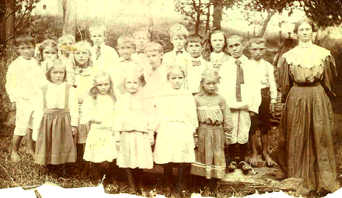 My grandmother Mae Lilly Thayer is the second from the left, second row. She was born in 1899 in Lincoln county and I'm guessing that she is about 7 or 8 yrs old.