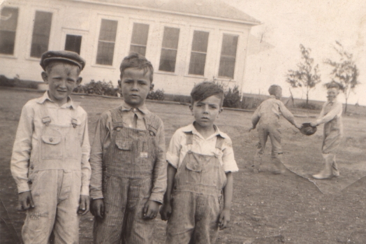 A teacherage was where the teachers could live; today we would probably call it an apartment house. Picture taken around 1937. The five boys left to right are Billy Earl Butts, John Paul Lock, Henry Roberson (*1), ?, ?.