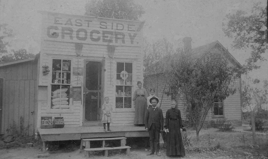 East Side Grocery "This photo was among my grandparents things. I don't know which side of the family it is, but I suspect it is from my grandmothers side. My grandmother, Mary (Boyd) Spurgeon, moved with her family to Oklahoma from Cowley Co. Kansas in 1890. They were on the 1890 territorial census living in Stillwater. On the 1900 census, they were living in Clear Creek Township near Orlando (Logan Co.) The family moved to Agra(Lincoln Co..) around 1903." If