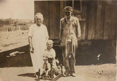 click to view larger photo![]() Theodore William McElroy (06 Oct 1917-03 Feb 2009) and adoptive maternal grandparents, Alexander A McDanel (02 Nov 1855-27 Nov 1942) and Henrietta "Etta" Fowler (20 May 1857-10 Jan 1938). Location - believed to be Jennings, OK or Oilton, OK area. |