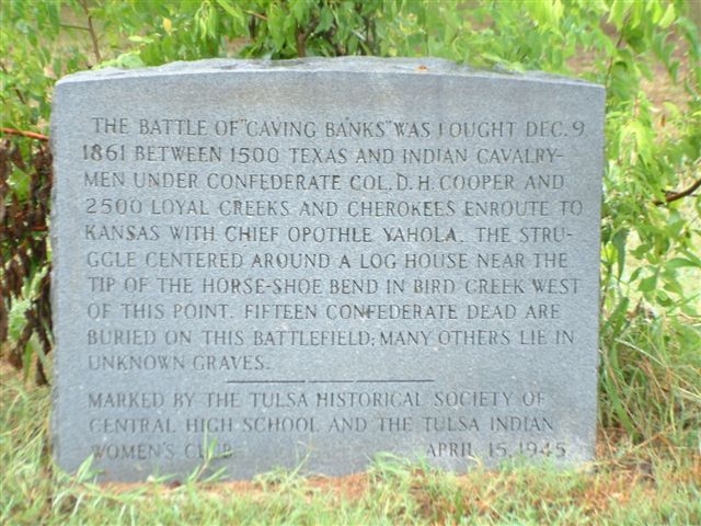 Monument to the Battle of Caving Banks. A Civil War Battle that took place about 1 mile North of 86th Street on Delaware near Sperry, Tulsa County, Oklahoma.
