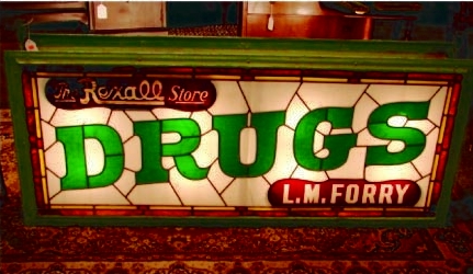 Stained Glass sign over back bar of soda fountain (later date)