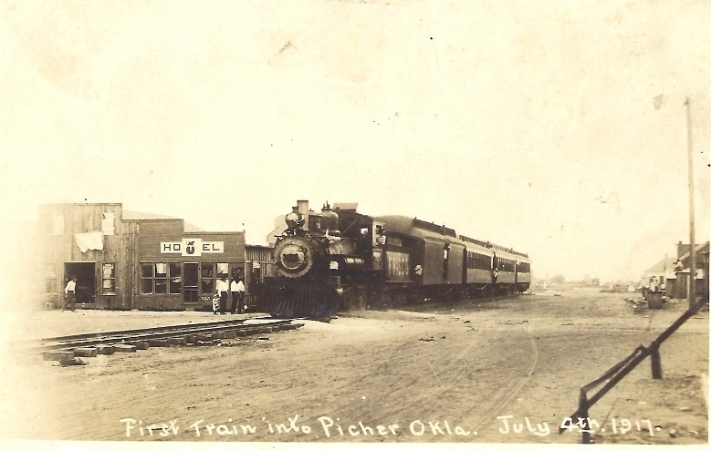 First Train July 4, 1917 My grandfather (from Alexander County, Illinois) was a traveler, and, thankfully, identified his photos right on the images themselves. Supposedly, this is the "First Train into Picher Okla. July 4th, 1917." My grandfather would have been 23 years old at the time, and, I think, headed for adventure in Arizona, before returning to Thebes, Illinois, and marrying my grandmother in 1925.