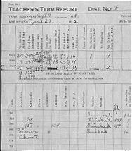 Bethel Union School - teachers were Miss Viola Brown, & Miss Daisey Vivera [Vera] Nichols [my grandmother Vera Lytle]. This was her [Vera's] first school. One of the students in the second row with "Bee" written on the photo is my great Aunt Bernice Nichols Sanders Holt. The Teacher's Term Report [below] shows names, ages and appears to include days absent & grade level.