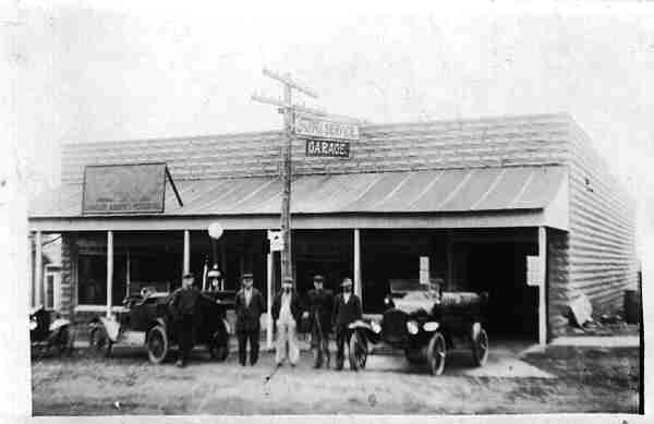 | Here's an early day shot taken in downtown Luther. The building stillstands on the north side of First Street, between Main & Ash. Back then, it was Rogers' garage. Mr. Rogers is one of the men. Another is J. LWIGGANS, who moved away in 1928 so that helps me date it. |
