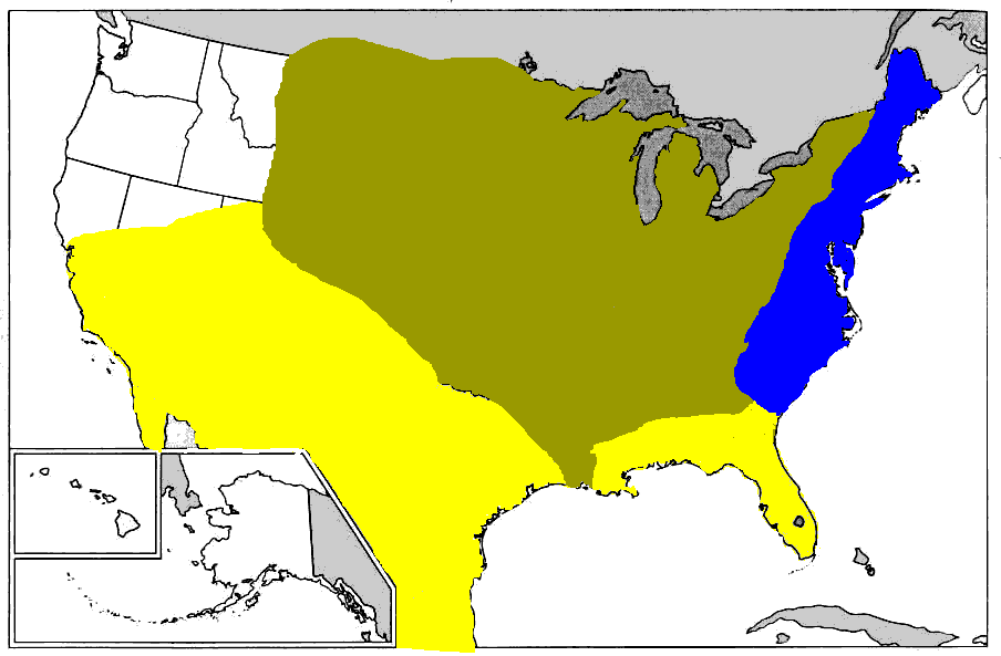 In the early 1700s, Britain controlled the eastern coast (shown in blue), while France held the Mississippi Valley (shown in olive green) and Spain had Florida and the Great Southwest (shown in yellow). Only the British displaced the natives with their settlements, so in this period everything that isn't blue was generally considered to be "Indian Country".