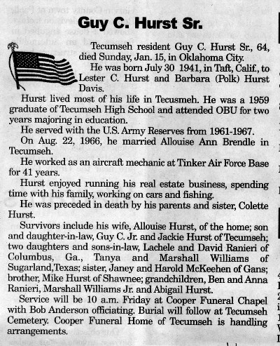 Brown of Shawnee; three sisters, Gwen Hoskins of Midwest City, Nancy Lynch of