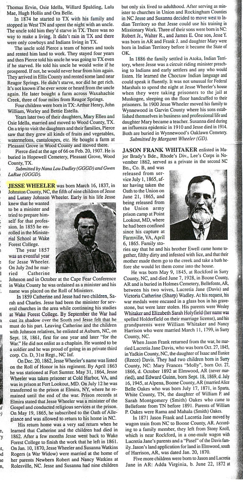 On Dec 20, 1862, Jesse Wheeler's name was listed on the Roll of Honor in his regiment.  By April 1863 he was stationed at Fort Sumter.  May 31, 1864, Jesse Wheeler was taken prisoner at Cold Harbor, VA, and was in prison at Fort Lookout, MD.  On July 12, he was transferred to the prison at Elmira, NY, where he remained until the end of the war.  Prison records at Elmira stated that Jesse Wheeler was a minister of the Gospel and conducted religious services at the prison.  ON May 19, 1865, he subscribed to the Oath of Allegiance and was allowed to return to his home in NC.