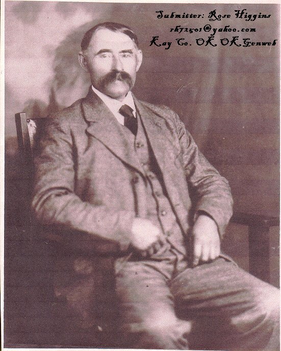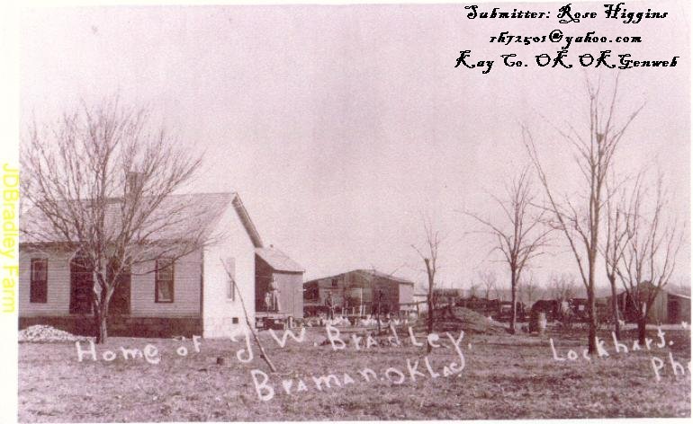 James W. Bradley and farm located in Braman in 1890. He married Kate Jennings who died in 1888. In 1899 he married Maggie Corn who died in 1909. Submitted by Rose Higgins, great granddaughter of James W. Bradley, Jan 2003 |