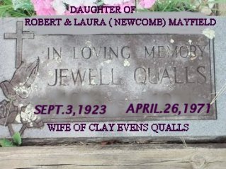 Jewel Dean Qualls wife of Clay Evens Qualls Sep 9, 1923 ~ Apr 26, 1971 daughter of Robert & Laura Mayfield |