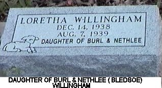 Loretha Willingham Dec 14, 1938 ~ Aug 7, 1939 daughter of Burl & Nethlee (Bledsoe) Willingham |