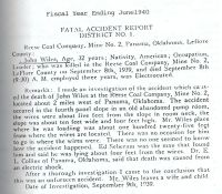 Remarks: I made an investigation of the accident which caused the death of John Wiles at the Reese Coal Company, Mine No. 2, located about 2 miles west of Panama, Oklahoma. The accident occurred in the fourth panel slope in an old abandoned pump room, the wires were about five feet from the slope in room neck, the slope was about ten feet wide and four feet high. Mr. Wiles place where he was loading was about one hundred twenty-five feet from where the wires are located. There was no occasion for him to g in where the wires were. There was no one seemed to know how the accident happened. Ed Seberam was the man that found him and said he was lying about four feet from the wires. Dr. E. L. Collins of Panama, Oklahoma, said that death was caused from an electric shock.