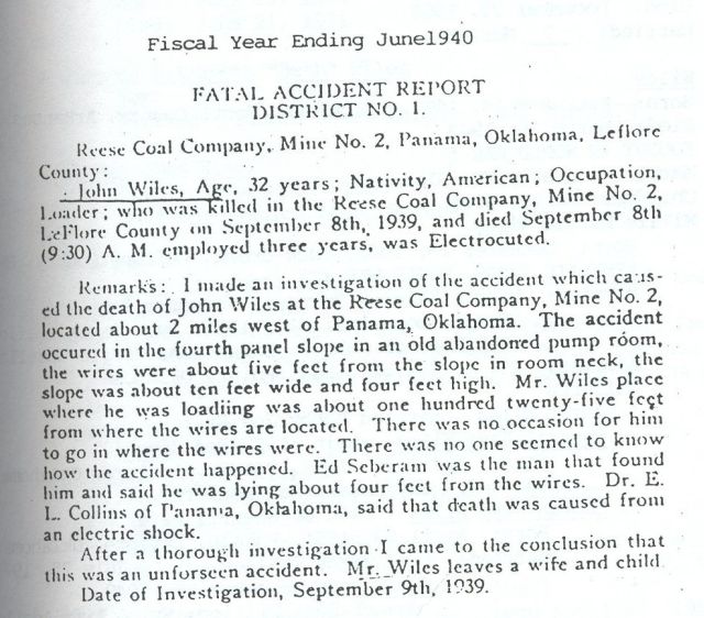 John Wiles, Age 32, years; Nativity, American; Occupation, Loader; who was killed in the Reese Coal Company, Mine No. 2, LeFlore County on September 8th, 1939, and died September 8th (9:30) am employed three years, was Electrocuted.