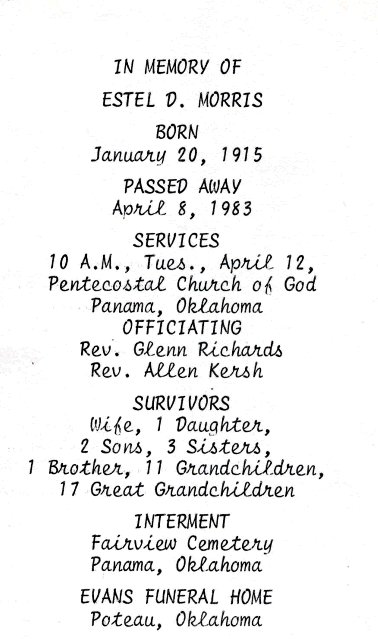 Funeral services were held at 10:00 a.m. Tuesday, April 12, 1983, for Estel D. Norris. Reverend Glenn Richards and Reverend Allen Kersh officiated at the Pentecostal Church of God in Panama, Oklahoma.