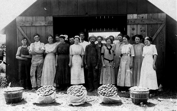 The peaches were Elbertas. About 15 or 20 pickers would bring the peaches to the packing shed on large, flat-bed wagons pulled by horses. The packing shed could be opened on all sides. Some 20 women were hired to pack the peaches which were emptied into bins for sorting and packing. The top of each bushel basket was "ring packed" with the nicest looking peaches. The fuzz on the peaches made the packers very uncomfortable, so they used talcum powder on their arms. The younger Scheihing children carried cold water to the shed for the packers to drink.