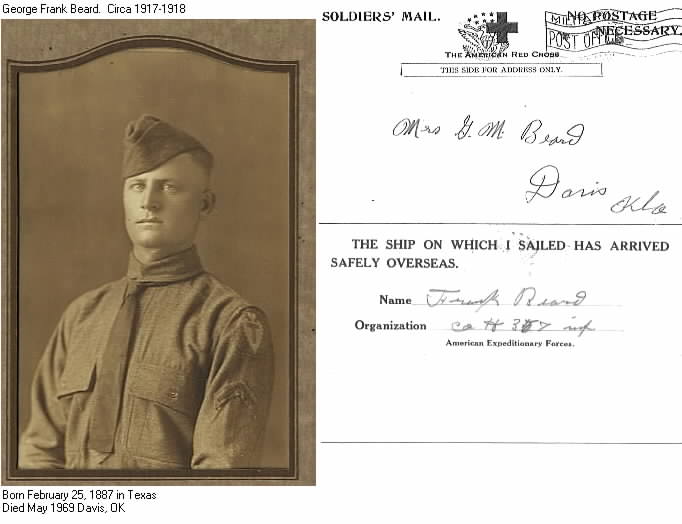 OklahomaPVT CO H 357 Infantry World War I Death dates on the two markers disagree. Printed in The Davis News on Feb. 6, 1919; Reprinted with permission Frank Beard Arrives Home Pvt. George F. Beard, of Co. H, 357th Inf., returned Saturday to his home in Davis from Camp Pike, Ark., where he received his honorable discharge from Uncle Sam's service. He left Camp Travis, Texas, June 10th, 1918, for oversea and landed in France and was soon up to the front, but took the trench feet about two hours before time to go over the top, and was placed in the hospital. Frank landed in New York Dec. 11 and says he wouldn't take anything for the trip but isn't at all anxious to go back. His mother, Mrs. L.V. Beard says she is very thankful that one of her sons returned home in as good condition as he is. She has two more sons in the service. Frank is the oldest of the three. Mrs. Beard received a letter Sunday from her son Willie Beard, M. G. Co., 142 Inf., and he was still in France enjoying good health and thinks he may get home in March. She hasn't heard from her son, Corp. Poke Beard, since Dec. 9th when she received a telegram saying he was wounded on Oct. 4th. George Frank Beard Born Feb 25, 1887 - Died May 1969 |