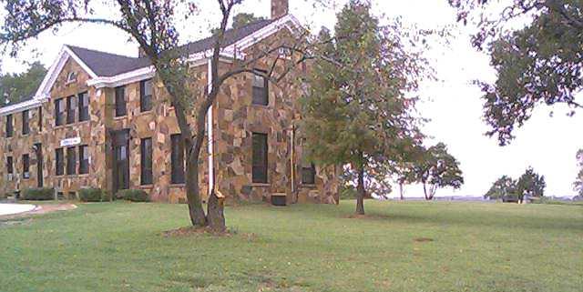 Journeycake Hall on the campus of Bacone College. The cemetery is visible in the lower right side of the picture.
