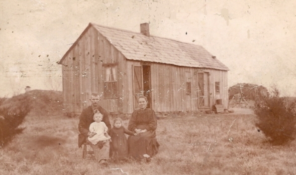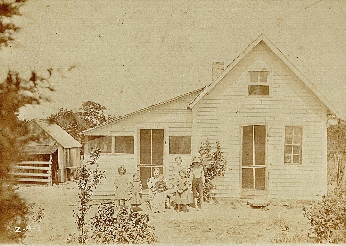 Here's another picture taken at their homestead in 1908 or 1909: From left: Eva, b. 1902; Mildred b. 1905; Anna holding Myra b. 1907; Ada b. 1903, d. 1910; Standing behind, Laura b. 1898 and Wayne, b. 1900. |