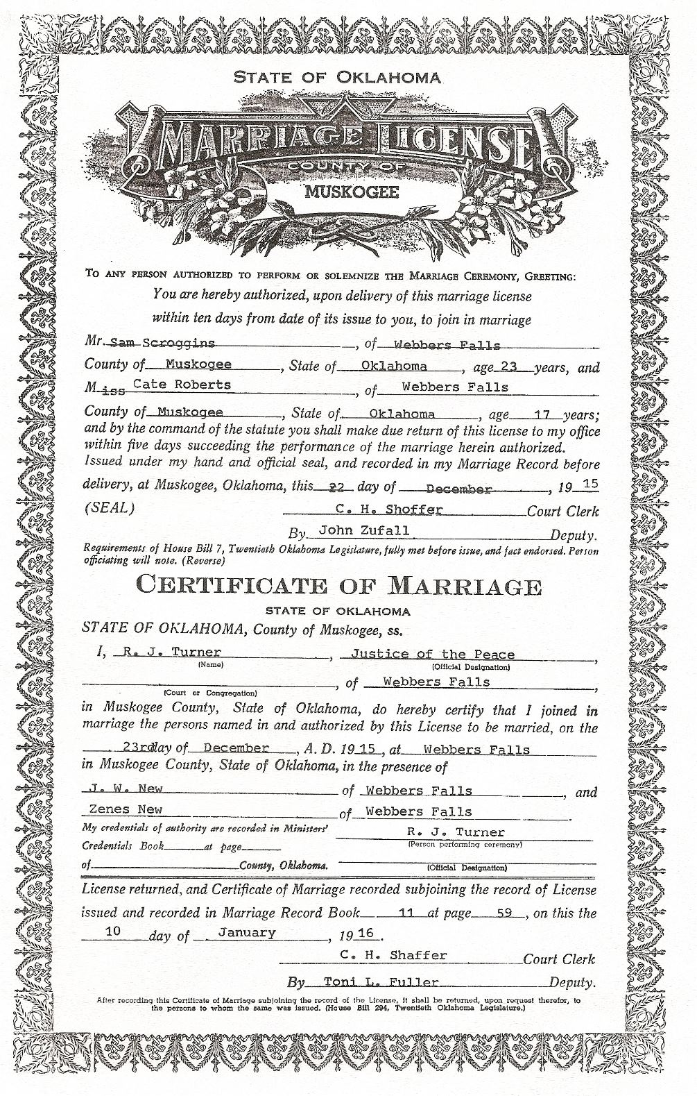 Sam married Kate Jane Asher Roberts in Webbers Falls, Muskogee Co. OK in 1915.