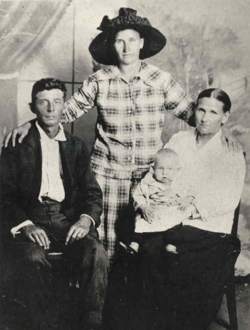 Sam and Kate Scroggins and Kate's mother, Mollie Narcissus Potter Asher who is holding Sam & Kate's oldest child, Lee Scroggins. Kate Jane Asher was born January 12, 1899 in Missouri. She died October 16, 1945 in Vinita, Oklahoma. Kate's parents were Frances Leonard Asher and her mother was Mollie Narcissis Potter. Mollie who was called "Wassie" is buried in the Dripping Springs Cemetery outside of Maud, Oklahoma in Pottawatomie County.