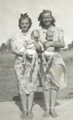 This is my grand-mother on the left Estelle Mouser holding my mother Joyce Ann when she around 10 months old. and on the right is my Aunt Tesse Breshears and her son Floyd Jr. Place taken unknown; Date about 1941.