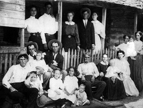 This photograph is a family portrait of the descendents of Elsie Beams Roebuck Hart Walker and her second husband, Cornelius Hart. Cornelius and Elsie Hart had a son named Lemon Hart Sr. Lemon Hart's only son Eastman Hart, Sr. is surrounded by his children and grandchildren on the front porch of the Hart homestead on Bokchito Creek near Soper. Two of Eastman Hart's children are not in this photograph, his son Lemon Hart, Jr who died in 1899 and his daughter Susan Jr. Hart Armstead Putnam.